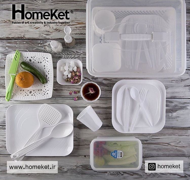 هوم کت برای سرویس مسافرتی ۶۰ پارچه هوم کت، باکس پلاستیک نیمه شفافی طراحی کرده است، که همه ظروف به خوبی در آن جای میگیرد و حمل و نقل آن ها را آسانتر میکند. جعبه این سرویس و کلیه ظروف آن از پلاستیک مرغوب است و براحتی قابل شستشوست و دربرابر آب و مواد شوینده دچار خوردگی و آسیب نمی شود.